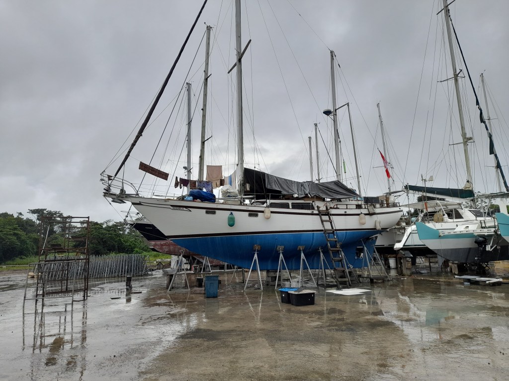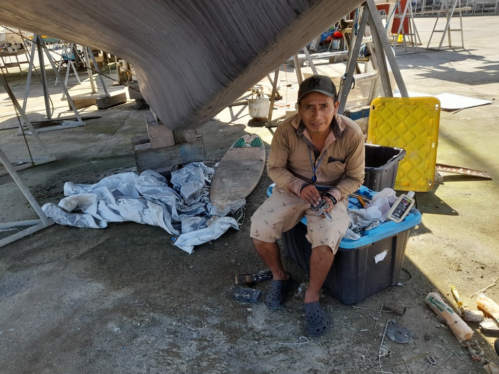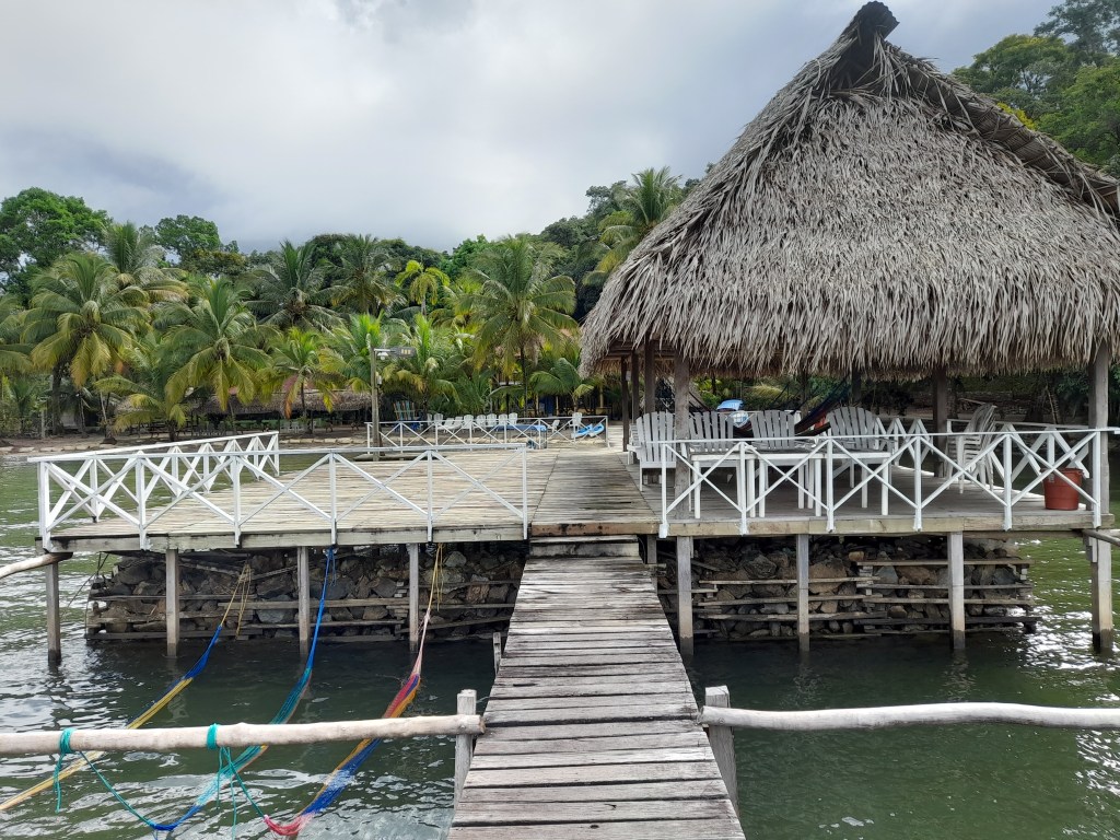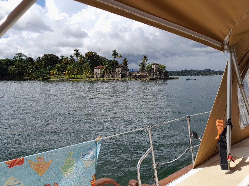 The place was reported to have one of the beast beaches in the lake but recent flooding and removed much of the sand. We only spent the day at Denny’s beach before heading back to the Rio. It was nearing sunset when we entered the month of the river to sail past a magnificent site. The Castle of San Felipe de Lara is a Spanish colonial fort built in 1644 at the entrance to Lake Izabal in eastern Guatemala. Will make an effort to see it from the land on our next trip. We anchored back off of marina Nana Juana for the nigh where we received a visit from Jessica, who had made us our new dodger. Her and her husband came by to put a few more snaps on the dodger and to deliver the new curtains they had made for the boat. it was nice to take down the soiled towels we had been using lately and hang the new drapes.