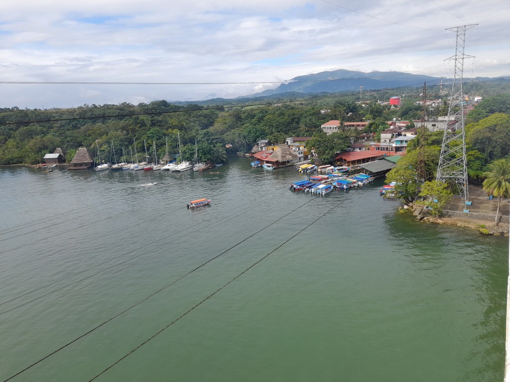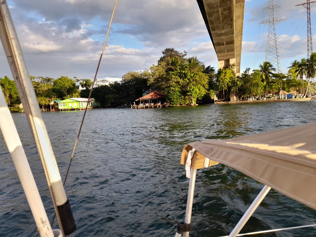 It was late afternoon by the time we got underway and to sail under the bridge and past the busy town of Fronteras. We had approximately 15 miles to go to our indented anchorage in Lake Izabal. The river that flows past the town of Fronteras was busy as usual with panga traffic. Typically, with people and goods being shipped up and down the river. There were even a few dugout canons with lone fisherman casting nets and lines into the turbid waters.