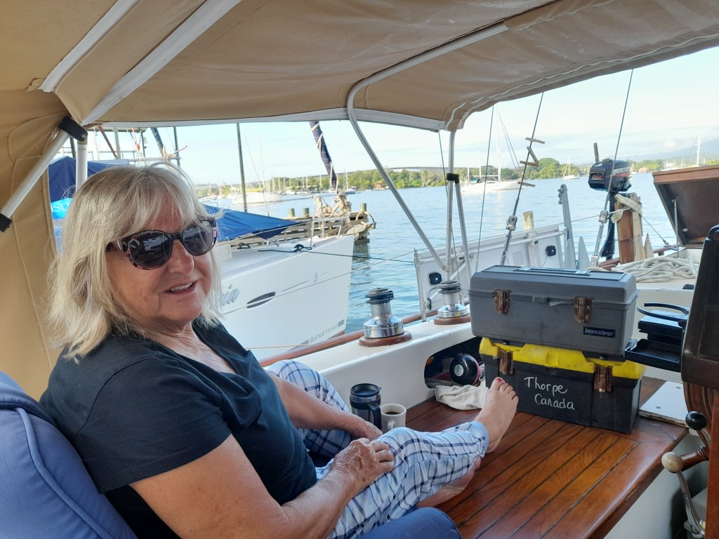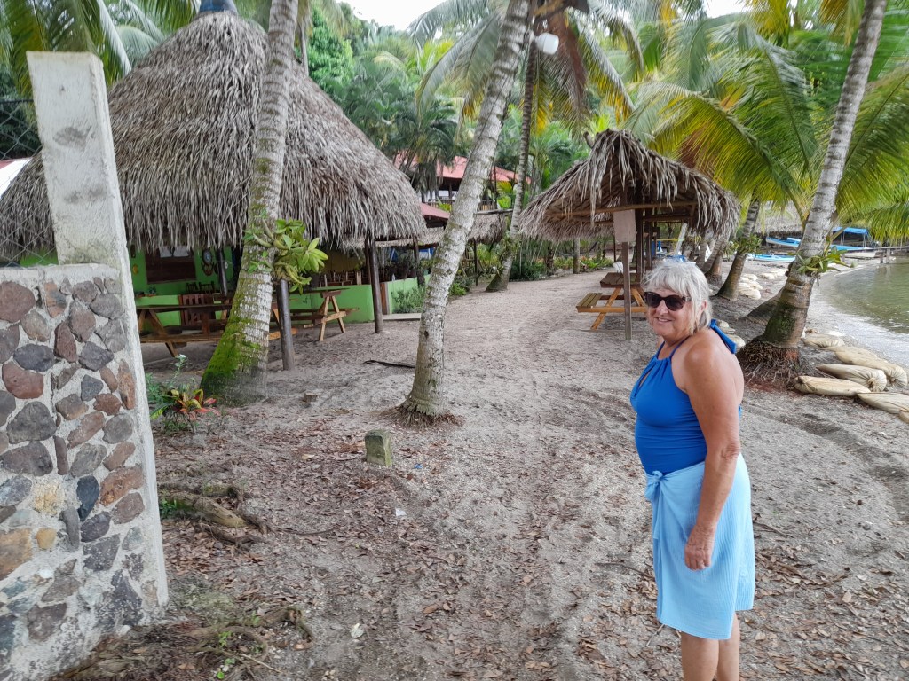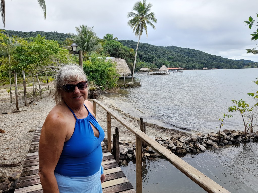 My sister Jackie at marina Nana Juana with the bridge and waterway leading to Lake Izabal.
