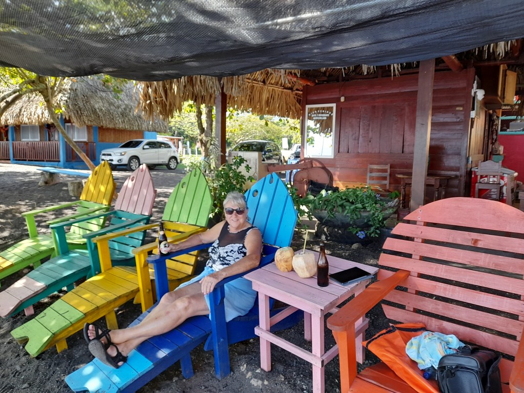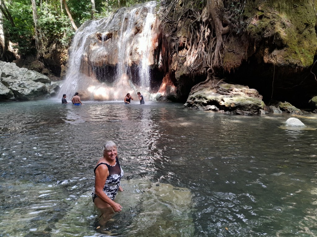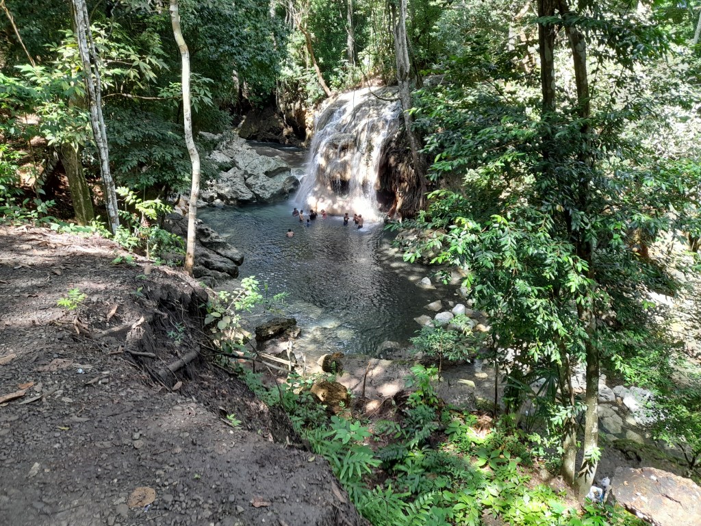 In the morning we took the dink ashore to land on a dock at a small, rustic hotel where we were greeted warmly by the owners. After a brief talk and a negotiation, their son agreed to drive us the two miles or so into the jungle to the “The Cascadas at Finca El Paraíso” and national park a waterfall comprised of a hot spring.