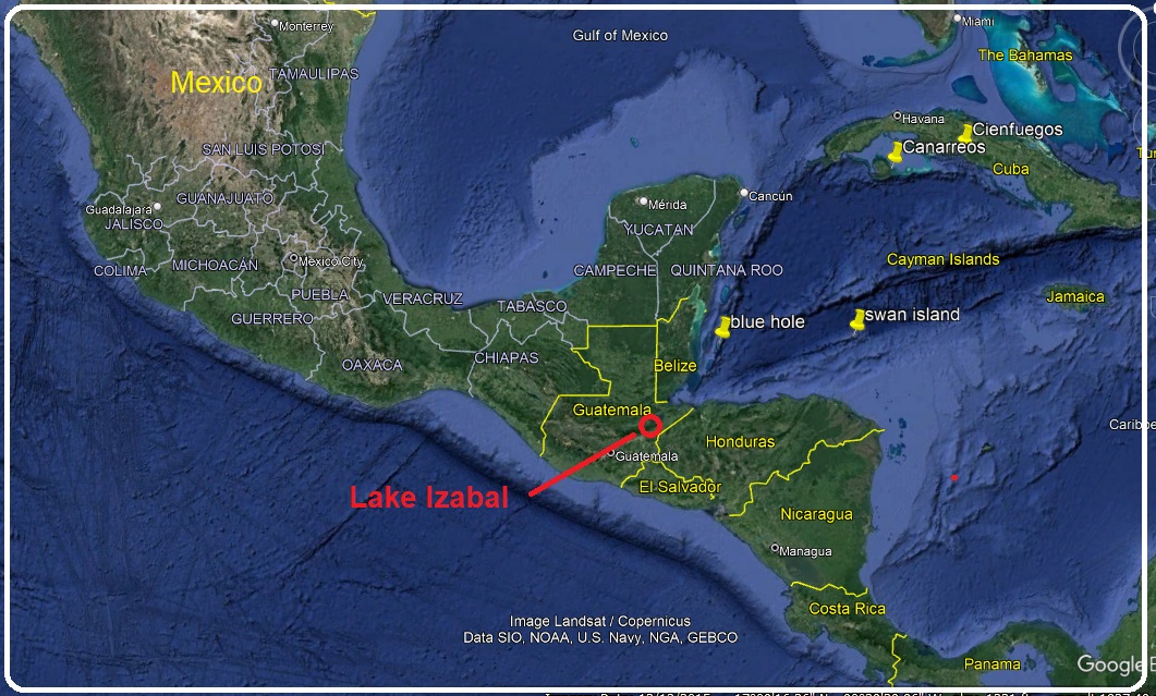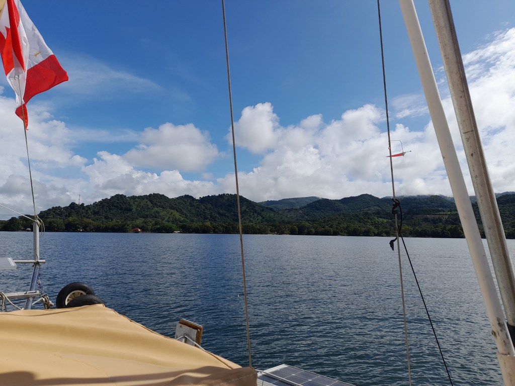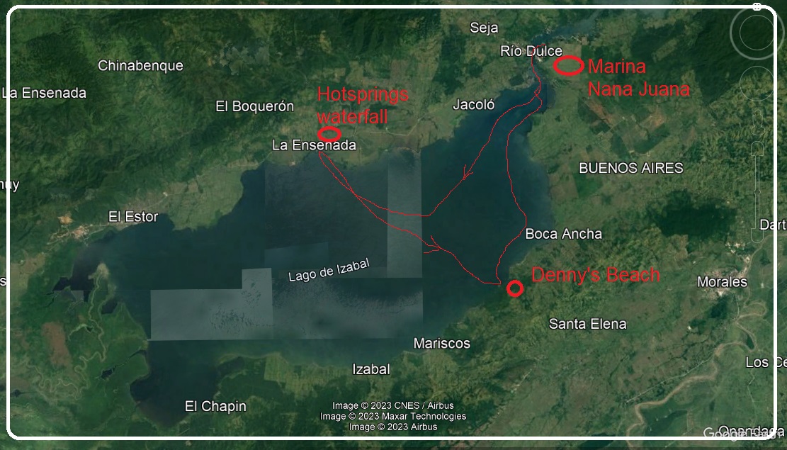 Lake Izabal id the largest lake in Guatemala coving almost 600 sq/kilometers. The lake is 24 nautical miles long and 10 or 12 miles at its widest. It’s a shallow lake with an official with much of it less than 40 feet deep. Its reported that the deepest section is only 60 feet but we would cross over a section that was over 70 feet.