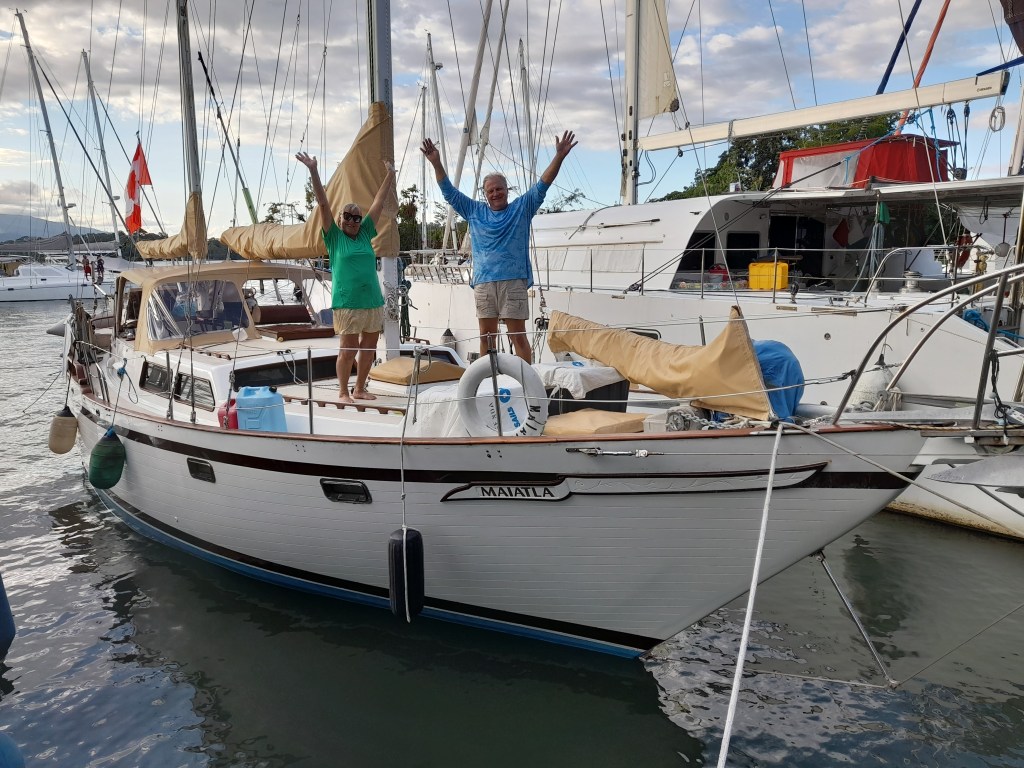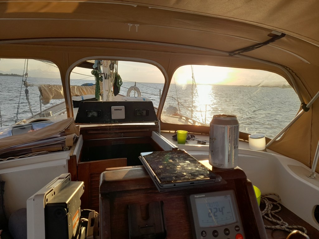 We had several thundershowers pass through the area in the morning but as we sailed under the bridge the clouds and the sun broke out and the wind filled in. By the time were passed the old fort, Castillo San Felipe, I had unfurled the headsail putting us onto a nice run. Some friends who saw us depart motored out in their dinghy to say their final farewells, it was a great send off as the sun began to set to the west.