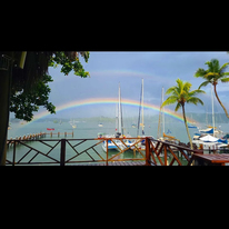 We only spent the day before heading back to the Rio. It was nearing sunset when we entered the month of the river to sail past a magnificent site. The Castle of San Felipe de Lara is a Spanish colonial fort built in 1644 at the entrance to Lake Izabal in eastern Guatemala. Will make an effort to see it from the land on our next trip. We anchored back off of marina Nana Juana for the night where we received a visit from Jessica, who had made us our new dodger. Her and her husband came by to put a few more snaps on the dodger and to deliver the new curtains they had made for the boat. it was nice to take down the soiled towels we had been using lately and hand the new drapes.