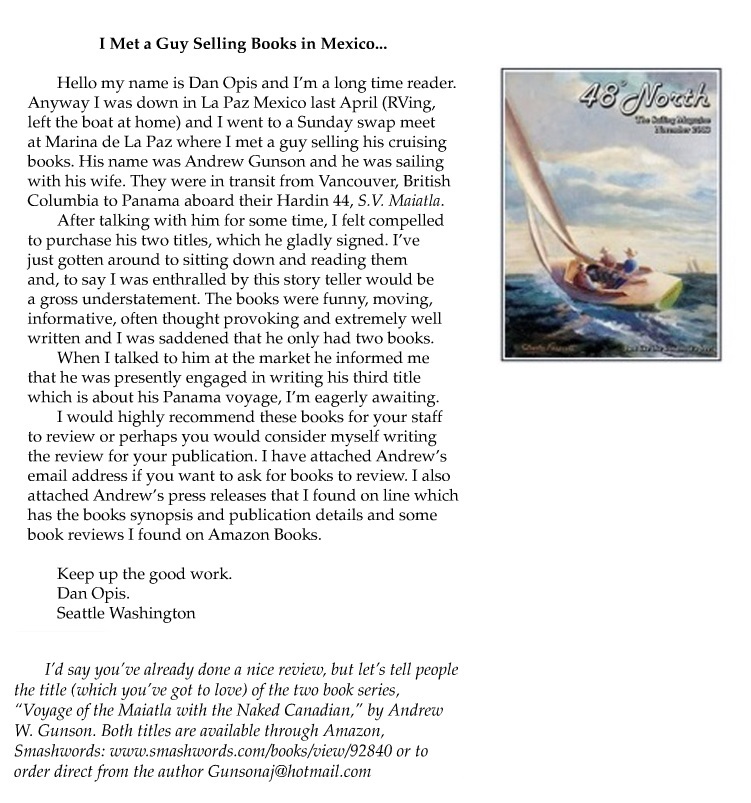 Vancouver, Canada, to México. The third book in the Naked Canadian Cruising Series. Andrew Gunson and his first mate, Janet, leave their home port of Ladysmith, Vancouver Island, for a four-year odyssey bound south for the Panama Canal and the Caribbean Sea Beyond.